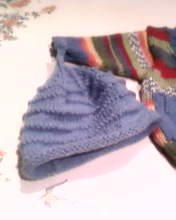 due ferri a m rasata,poi al ferro successivo:”2 m al diritto e poi 2 assieme”( ripetere per tutto il ferro) , dopo due ferri :”3 m dir e 2 assieme”( ripetere per tutto il ferro), resteranno 4 m, lavoreremo su queste m a m rasata per 2 cm, tagliare il filo per 25 cm circa, infilarlo in un ago da lana e passarlo nei 4 punti , tirare e cucire il “picciolo” poi il dietro del berretto.