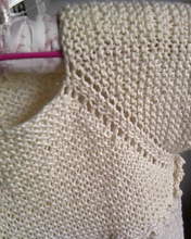 A la fin des augmentations, travailler sur les m du derrière gauche et de la manche gauche jusqu’à la deuxièeme des 2 mailles à la fin de la manche, tourner et travailler seulement sur les mailles de la manche( jusq’à une des 2 mailles qui divident) et faire 5 rans en jersey, 1 rang de jours( 2 droit” 1 jeté, 2 m ensenbles” pour tout le rang) encore 5 rangs jersey et rabattre souplement.