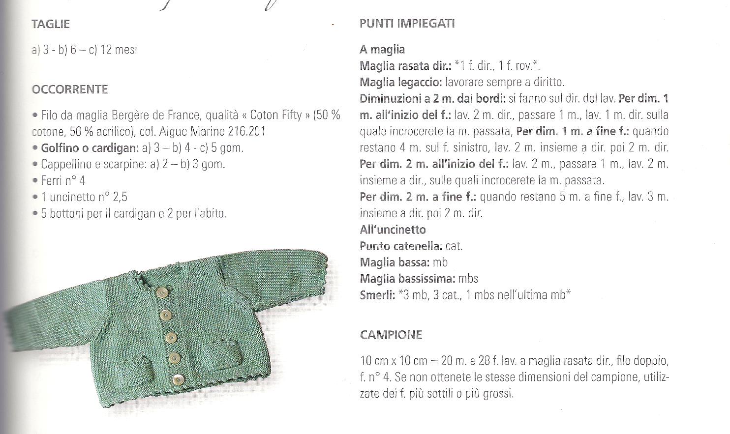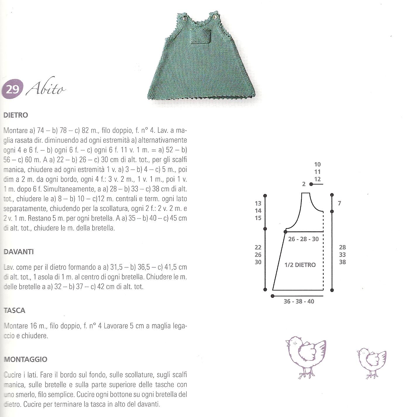 Devi misurare un vestitino della bambina, e se vuoi fare un lavoro preciso, guarda nel campione quante m ci sono in 10 cm e poi moltiplichi per la larghezza che vuoi ottenere, io semplicemente monterei 4 m in più( 2 per parte) e le bretelle più lunghe, e lo stesso per il cardigan con qualche cm in più per le maniche.