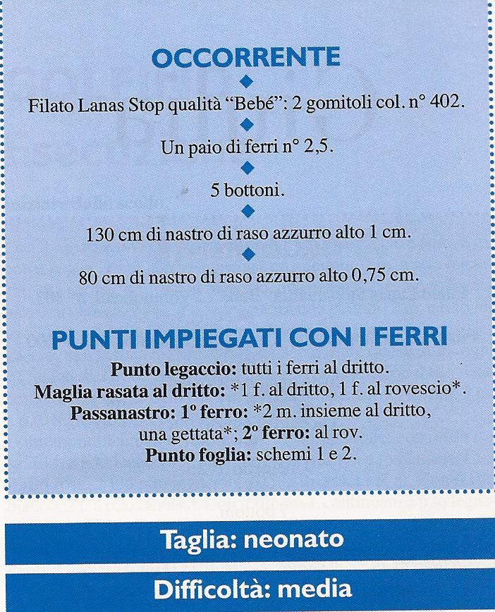 Per misura 12/18 mesi e ferri 4,(ma se lo volete misura 6/9 mesi usate ferri 3,5 e per la misura nascita ferri3, prematuri:2,75( oppure 2,5); ovviamente usate anche lane sempre più sottili : il n delle m da montare è sempre lo stesso)