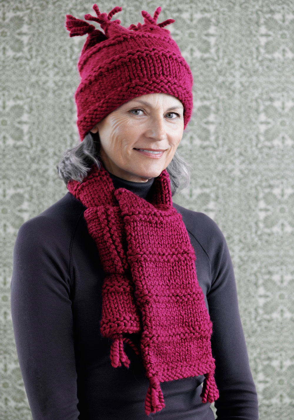 eccovi , da lavorare con ferri 8, sciarpa e berretto.