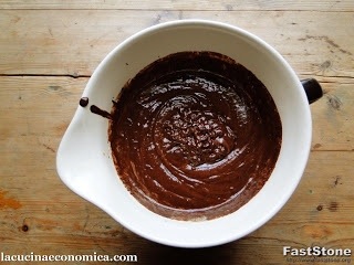 A parte, montate gli albumi con il pizzico di sale e il restante zucchero: sbattete fino a che non si formi una crema bianca compatta; poi, con un mestolo di legno o una spatola, incorporate delicatamente gli albumi montati a neve con lo zucchero al composto di cioccolato, mescolando dal basso verso l’alto. Il composto deve risultare come nella foto qua sotto:
