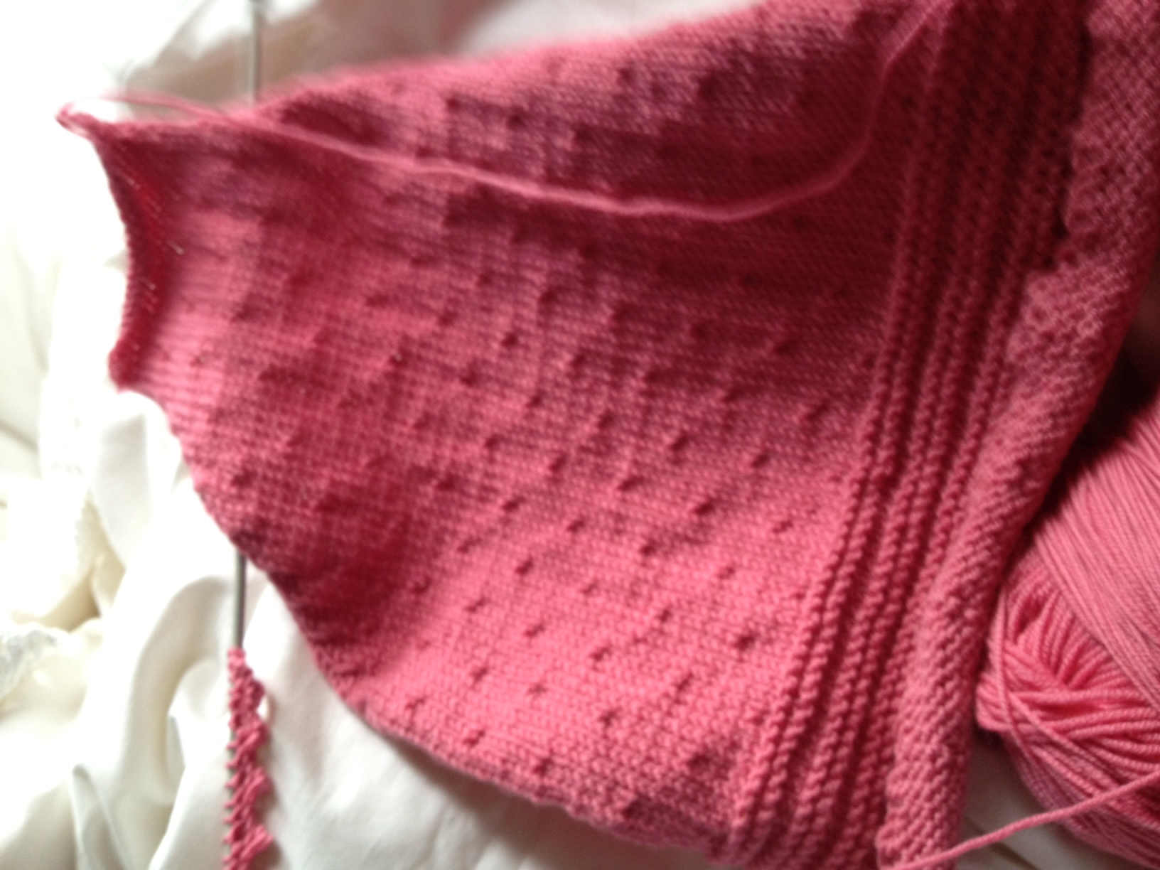 BORDO DEL CAVALLO-riprendere 20m(22-22) con i f 2,5 sul basso del davanti,lav 2 cm di coste cominciando e terminando con 2(3.3) m rov sul rov del lavoro.