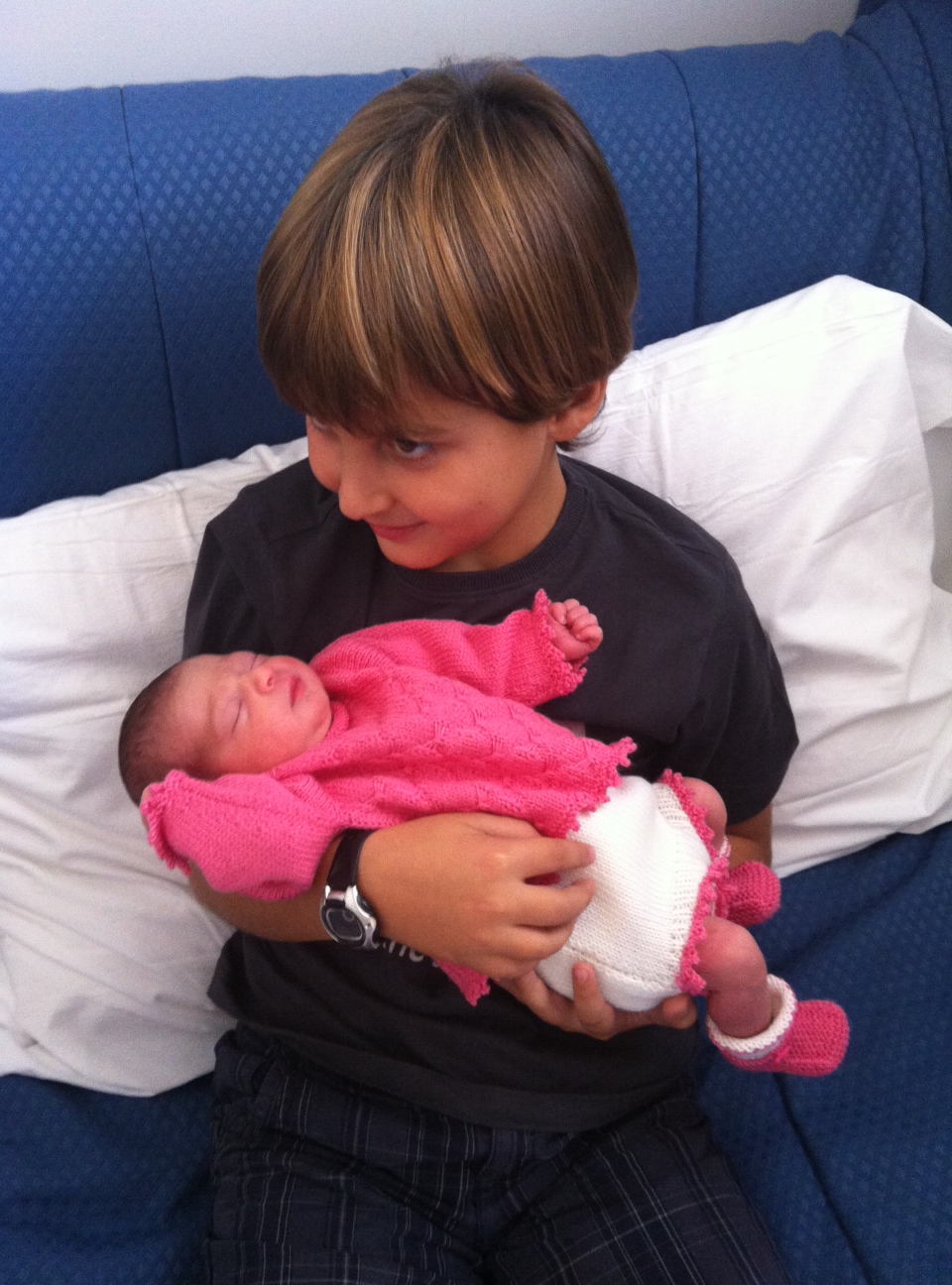 Non so per quale perversione maglieristica ma l’originale dice che per le prima 3 misure dovete fare il dietro in tinta unita e le maniche a righe e per le altre misure al contrario, io vi dico…fate come meglio vi ispira e a seconda della lana che avete..