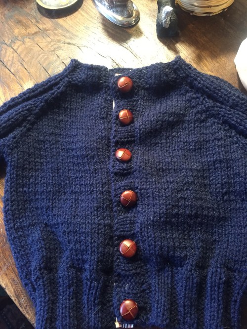 Proseguire lavorando davanti e dietro di seguito e ricordandosi di fargli le asole: dopo la quarta asola lavorare fino a metà strada tra la quarta e la quinta proseguire poi a coste con i ferri più piccoli e fare allo stesso tempo l’ultima asola nel bordo poi fare ancora qualche ferro a ciste quindi chiudere le m lavorando a coste.