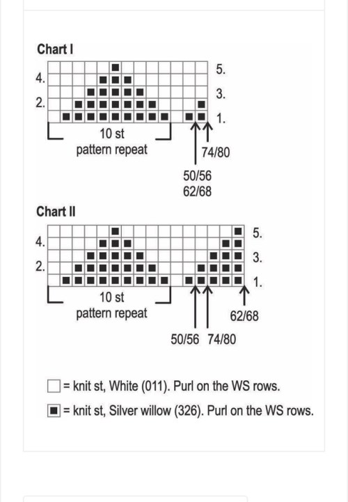A 7(8)9 cm, Iniziare il primo ferro dello schema due, il punto iniziale per ogni taglia è segnato da una freccia