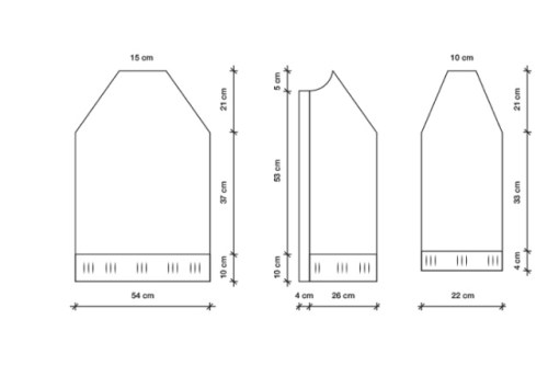 A cm 37 totali per lo scalfo diminuire 3 maglie – 1 maglia ogni 4 f. per 6 volte, 1 maglia ogni 2 f. per 3 volte. Intrecciare le maglie rimaste.