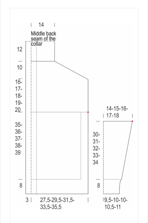 A 43(44)45(46)47 cm, continuare a lav a coste solo le 15 m del bordo del davanti e tutte le altre a p tessuto.