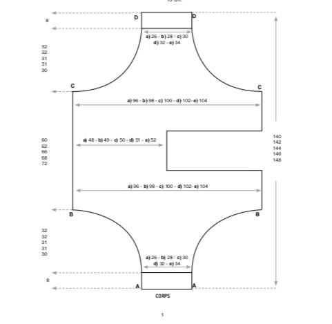 Á a) 132 cm – b) 134 cm – c) 136 cm – d) 138 cm – e) 140 cm. di altezza . tot., lav a coste 1/1, con i ferri . n°7 distribuendo 8 aum. al primo ferro .