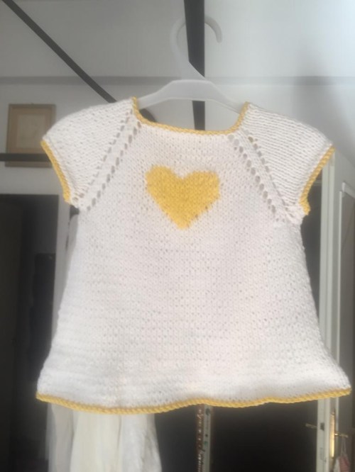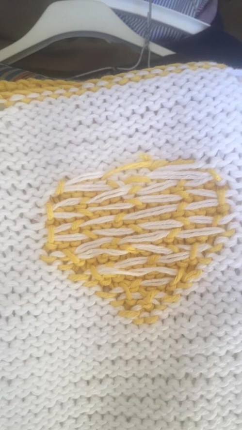 Rip questi 2 ferri Per 3/4 cm e dopo aver messo un marker ai lati delle 16 m centrali inizio a lav il cuore con il giallo; il filo bianco non il lavorazione lo incrocio con il giallo dietro al lavoro ogni 4/5 m