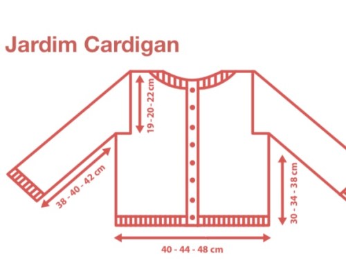 Lo schema è un multiplo di 20 maglie e 64 ferri per il corpo come anche per le maniche e si legge da destra verso sinistra ai ferri sul diritto del lavoro e da sinistra a destra sul rov del lav.