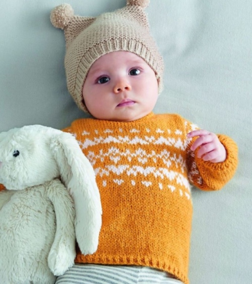 À 8 (10 – 12) cm de haut tot., cont. en jacquard sur les 26 rgs du diagramme, en commençant à la 3e (1re – 4e ) m. du diagramme. Cont. en jersey gold.
