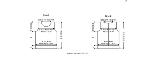 At a total height of A) 37 cm (86 rows), B) 38 cm (88 rows), C) 39 cm (90 rows), D) 40 cm (92 rows), E) 41 cm (94 rows) after rib st. for the neckline cast off the middle A) B) C) 19, D) E) 23 sts., and continue each part separately. Cast off on the neckline side every 2nd row 6 x 2 sts. and 2 x 1 st.
