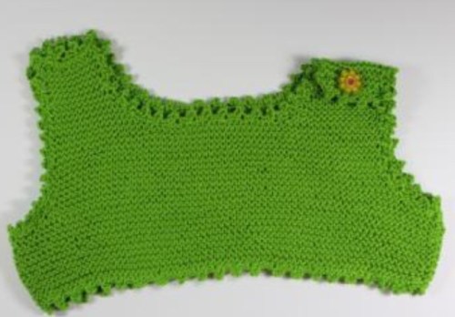 Cucire i fianchi e lav con l’uncinetto un giro a picot tutto attorno allo scalfo scollo spalle e bordo in basso .