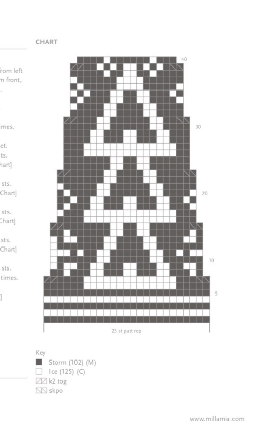 Un pullover lavorato a parti staccate ( dietro davanti e maniche ) fino allo scalfo, si uniscono poi le parti su un ferro circ e con delle diminuzioni e lavorando lo schema si termina fino al collo