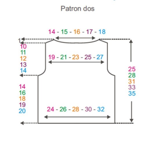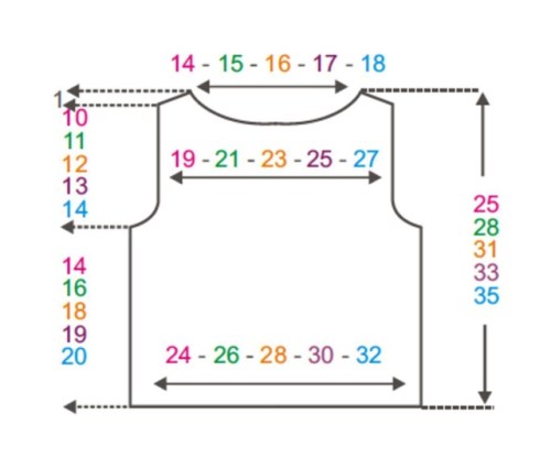 • A 21 cm (24-26-28-30) del p fantasia formare lo scollo chiudendo le 9 (11-11-13-15) m centrali poi cont a lav un lato alla volta chiudendo ai lati dello scollo: