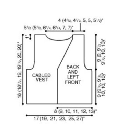 (DL) Iniziando dal bordo dello scalfo (ai ferri sul dir del lav) chiudere 2 (3, 3, 4, 5, 5) m poi 2 (2, 3, 4, 4, 5) m e allo stesso tempo , iniziando assieme al primo ferro delle dim dello scalfo dim una m allo scollo ( finendo al dir del lav)e poi ogni 4 ferri 1 (1, 3, 3, 4, 4) volte, ogni 6 ferri 3 (3, 2, 2, 2, 2) volte —13 (14, 14, 15, 15, 16) m rimaste per le spalle