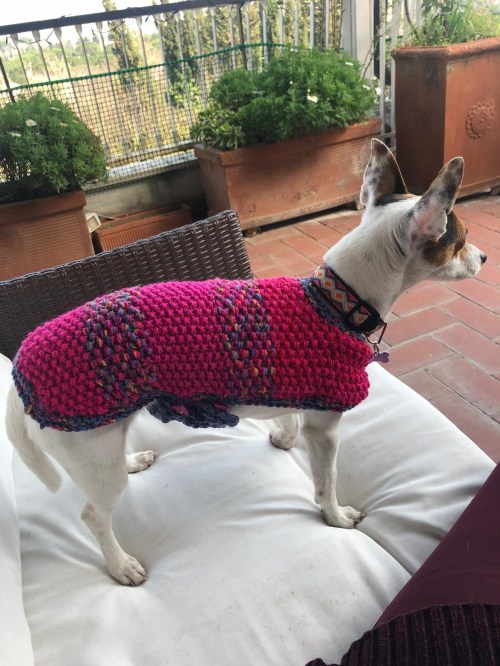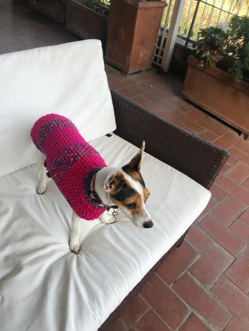 una Jack Russell slanciata e freddolosa .. scegliendo tra i tanti avanzi del mio caveau..e unendo assieme più fili anche di colori diversi, ho realizzato questo quasi cappottino, prendendo la spiegazione da qui: