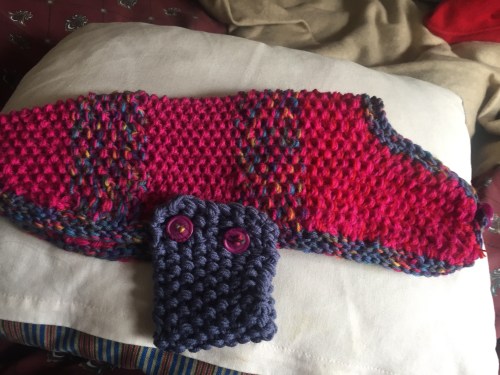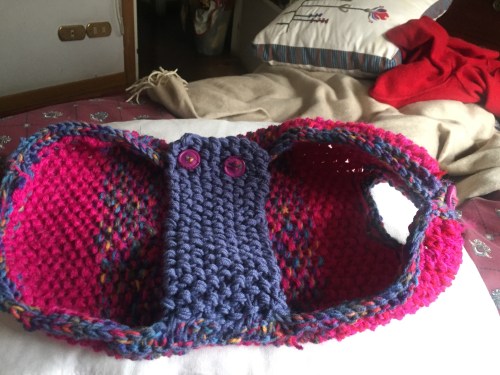 Per fare il bordo tutto attorno non ho usato l’uncinetto (sono negata…!) Ho ripreso le maglie tutto attorno con un ferro circolare lungo 60 cm e dopo due ferri a legaccio ho chiuso sempre al dritto sul rovescio del lavoro.