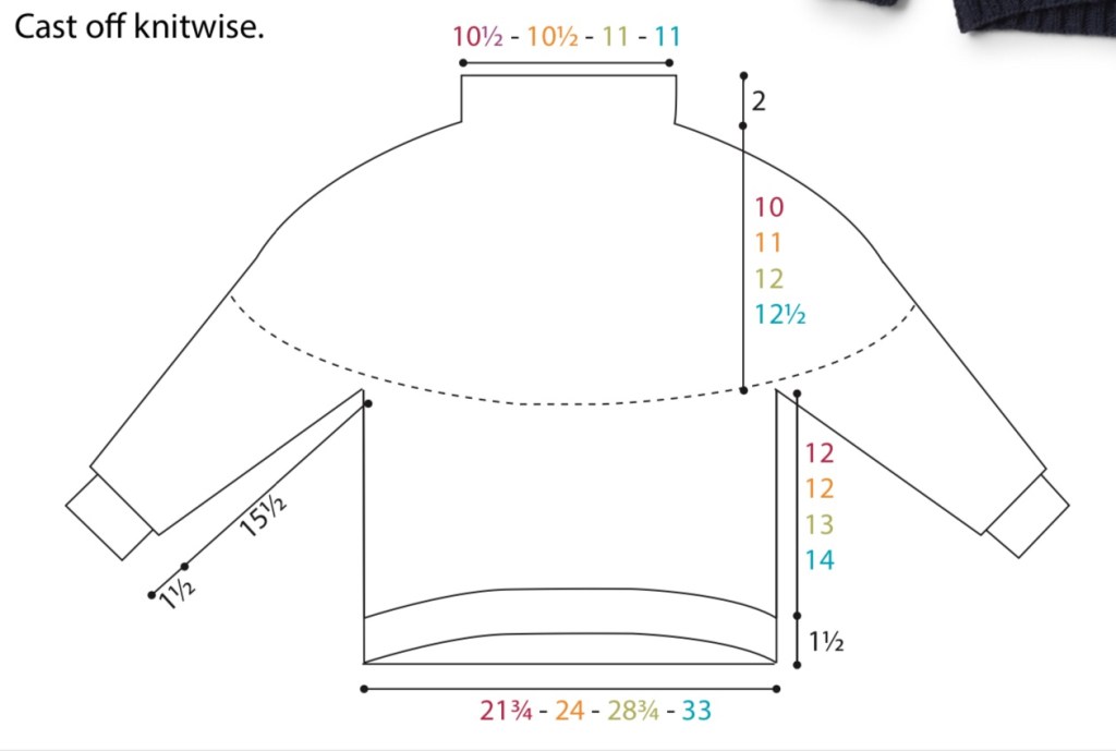 Lavorare a coste 2/2 per 5 cm, aumentando quattro maglie nell’ultimo giro: 80 maglie (80-84-84). Cambiare con i ferri più grandi e procedere in questo modo: g succ:*10 dir (10-7-7) M1*ripetere per tutto il giro: avremo 88 maglie (88-96-96)