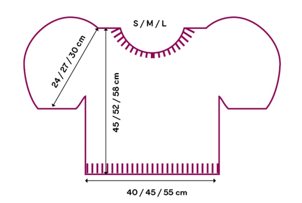 Lavorare con il filo doppio e in tondo questo modello Top Down (da sopra a sotto), a eccezione delle maniche che si lavorano a ferri di andata e ritorno. Le maniche hanno un effetto a palloncino grazie agli aumenti.