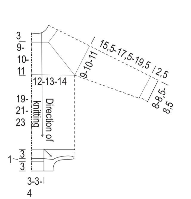 When the sleeve measures 15,5(17,5)19,5 cm from the armhole, knit 1 round and decrease 0(0)1 st at the end of round = 40(42)42 sts.