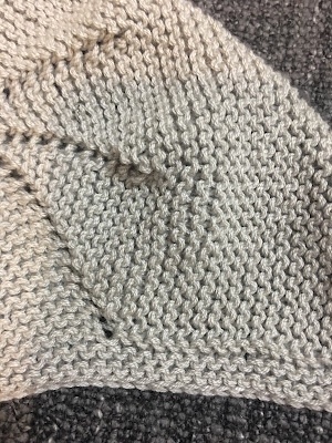 Si lavora con i ferri dritti a legaccio iniziando dal dietro e facendo degli aumenti ogni due ferri la parte anteriore si lavora legaccio fino al bordo dove si fanno dei ferri a maglia rasata con delle noccioline, si termina con sei ferri a legaccio. Si cuce la parte dietro posteriore e si fanno due laccetti per annodarli sotto il mento