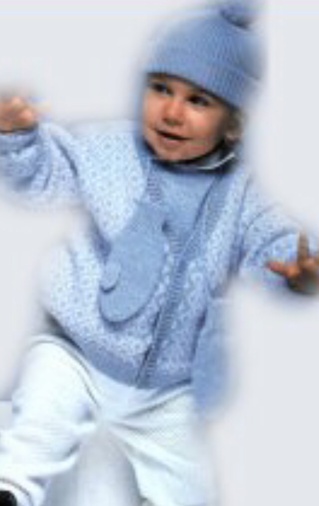 Montare 43 – 45 – 49 m. col blu. Lav . 3 cm a coste 1/1. Per la T.12 mesi, aum. 1 m. nell’ultimo ferro . Cont. jacquard cominciando a destra dalla m 22.