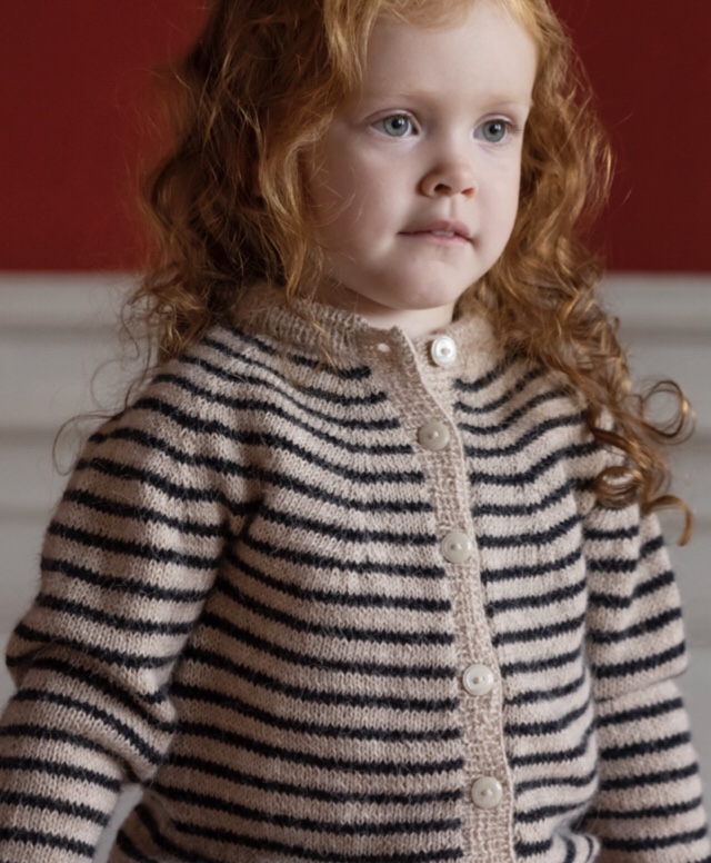 Questo semplice cardigan a righe è ottimo sia per i maschi che per le femmine . Si ispira ai costumi stretti a righe nere degli artisti del mimo e ai film muti di Charlie Chaplin. È lavorato in filato Indiecita, dall’alto verso il basso e in tondo
