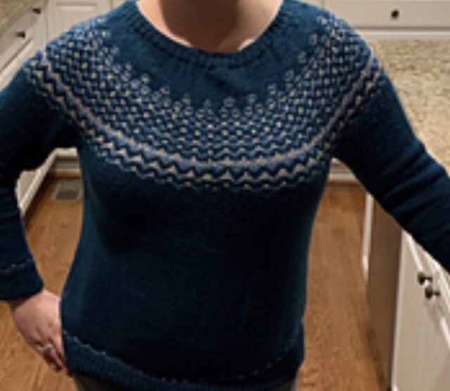 Pullover topdown e fairisle.. tradotto in italiano sarebbe : lavorato tutto assieme dall’alto in basso e con motivo .. jacquard.(.? )allo sprone..