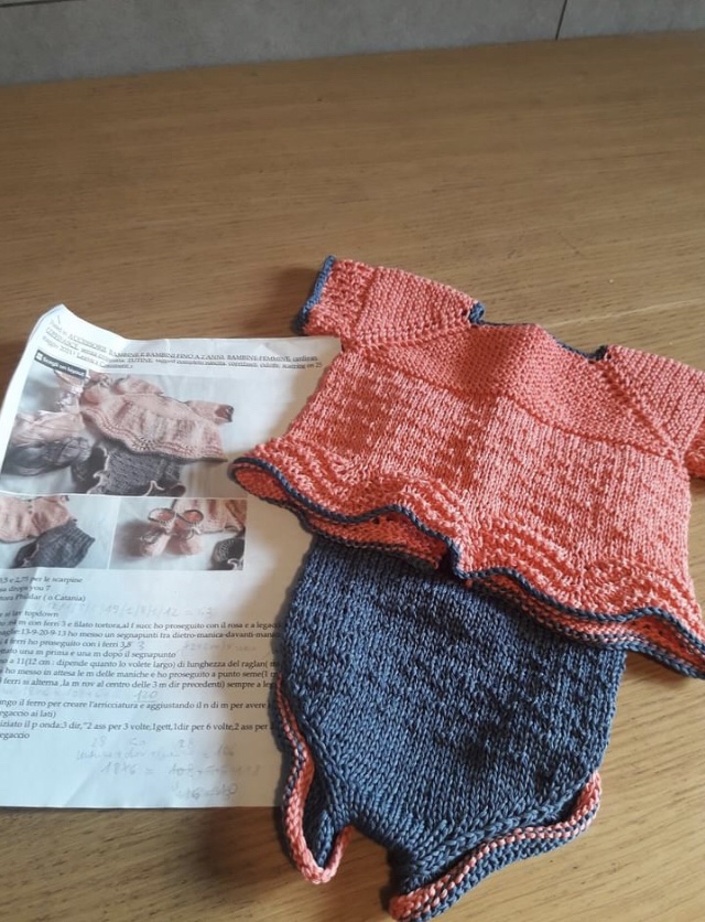 poi con i ferri 3,5 ho proseguito a p seme diminuendo 10 m sul ferro,a 15 cm dall’inizio ho fatto due dim ai lati ( a ds due acc,a sin due ass al dir per due volte 4 m in meno ogni due ferri,dopo la prima m e prima dell’ultima)e ho ripetuto le dim ogni due ferri fino ad avere 14 m,ho proseguito per 6 cm per il cavallo poi ho aumentato una m ai lati del ferro per 4 volte,( dopo la prima m un aum intercalare o un gettato che verrá lavoraro al rov ritorto nel succ,stessa cosa alla fine del ferro prima dell’ultima m)ho proseguito a p seme con 3 m ai lati a legaccio,fino a 12 cm dall’ultimo aumento,poi con i ferri 3 a coste 2/2 per 5 cm,aumentando 4 m lungo il primo ferro ,ho chiuso sul rov del lav lavorando a coste.