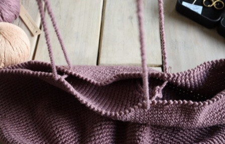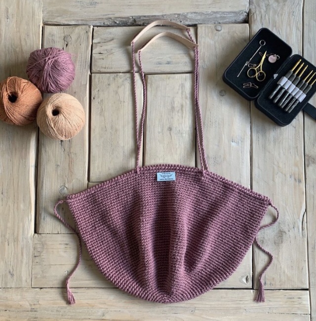 La borsa è tessuta dalla base a spirale ed è tutta a punto basso. Il cerchio viene ingrandito fino a raggiungere la dimensione desiderata e quindi continua ad essere tessuto senza aumentare per raggiungere l’altezza. Segna sempre il primo punto in modo da non perderti.