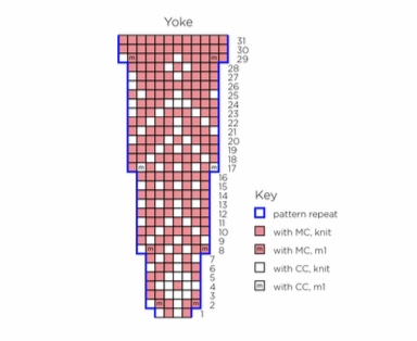 NOTE DEL MODELLO Questa maglia viene lavorata senza soluzione di continuità in tondo dall’alto verso il basso. Il corpo e le maniche sono separati al giromanica. Dopo che il corpo è stato completato, i punti intorno ai giromanica vengono raccolti usando il colore a contrasto e viene lavorato un bordo a costine. La scollatura e i polsini delle maniche sono lavorati nel colore a contrasto.