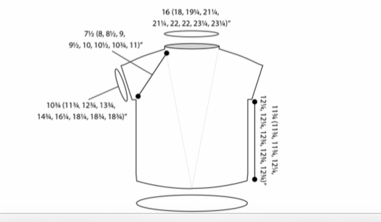 Aumenti: con MC ,4 dir,,(2-1-1),(m1,9 dir (5-4-4) per 2(10-16-4) volte ,(m1,8 dir(4-3-3) per 11( 7-1-33) volte, (m1,9 dir (5-4/4),] per 2(10-16-4) volte,m14dir(2-2-2)-16(28-34-42) m aumentate:148(160-168-176) m ottenute