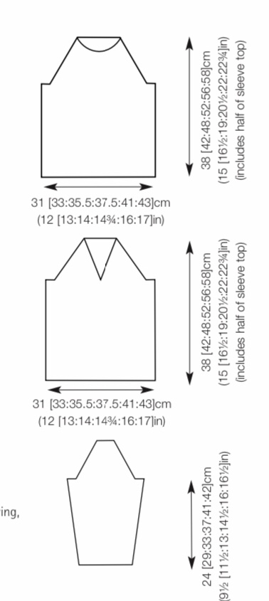 Cucire i raglan lasciando aperto il raglan dietro sinistro. Al dir del lav e con i ferri da 4 mm riprendere e lav al dir 12 [12:12:16:16:16] m dalle 14 [14:14:18:18:18] chiuse al top della manica sinistra , 24 [26:28:28:30:34] m dal lato sinistro dello scollo, lav al dir la m sulla spilla, al centro della V, riprendere e lav al dir 24 [26:28:28:30:34] m dal lato destro dello scollo , 12 [12:12:16:16:16] m dalle 14 [14:14:18:18:18] m chiuse al top della manica destra e 20 [24:24:26: 26:28] m dalle 21 [25:25:27:27:29] m chiuse del dietro dello scolloa: .