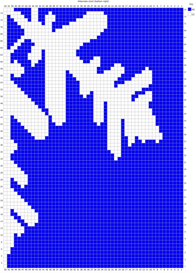 La coperta è lavorata a jacquard , un metodo che comporta di lav con gomitoli separati per ogni colore (piuttosto che fare passare i colori sul retro come nella tecnica fairisle ). Mentre stai lavorando , assicurati di prendere il nuovo filo di colore da sotto quello vecchio, incrociando così i due fili ed eliminando i buchi nel passaggio da un col all’altro