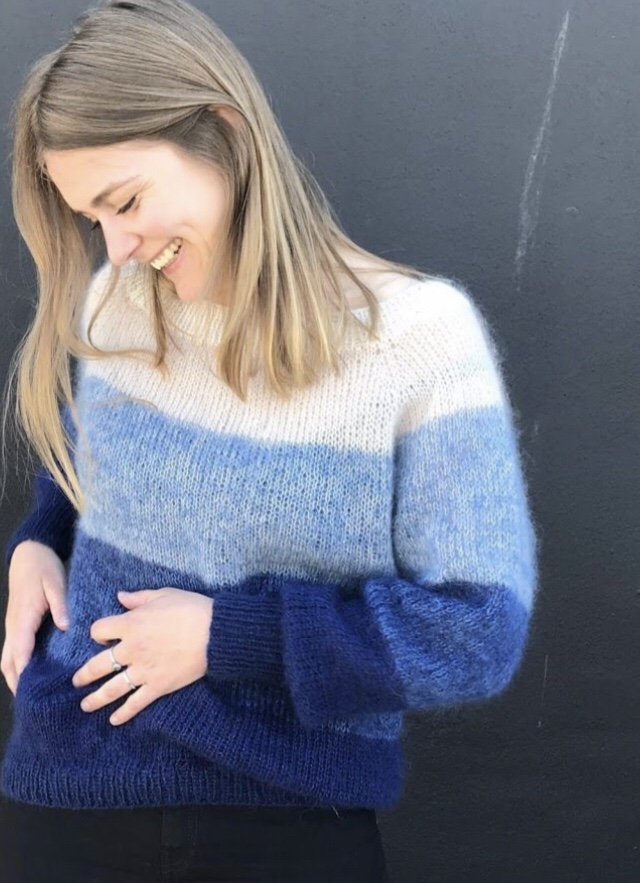 Cambiare con un filo di Kid Silk e un filo di Nature no 30 e lav per 10 cm a coste 1/1, chiudere lavorando a coste.