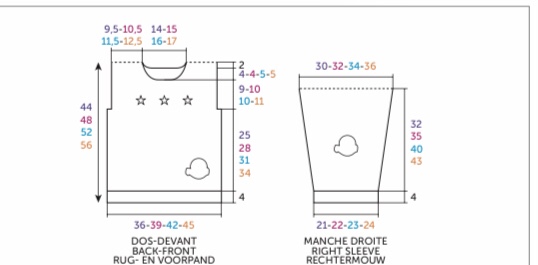 A 38-42-45-49 cm (88-98-106-114 ferri ) di altezza totale, chiudere le 9-11-13- 15 m. centrali e continuare ogni lato separatamente chiudendo ai lati dello scollo ogni due ferri : 1 x 3 m.,1x2m.,2x1m.
