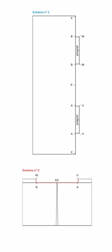 Fare corrispondere i punti X e X’, poi fare la cucitura dal punto V al punto W passando dal punto XX’ (= tratto rosso sullo schéma n° 2).