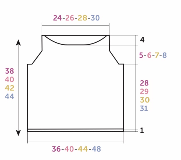 À 29-30-31-32 cm (94-96-100-104 ferri ) di altezza totale, chiudere ai lati 7-9-9-11 m., poi diminuire ogni 2 ferri a 2 m dai bordi :