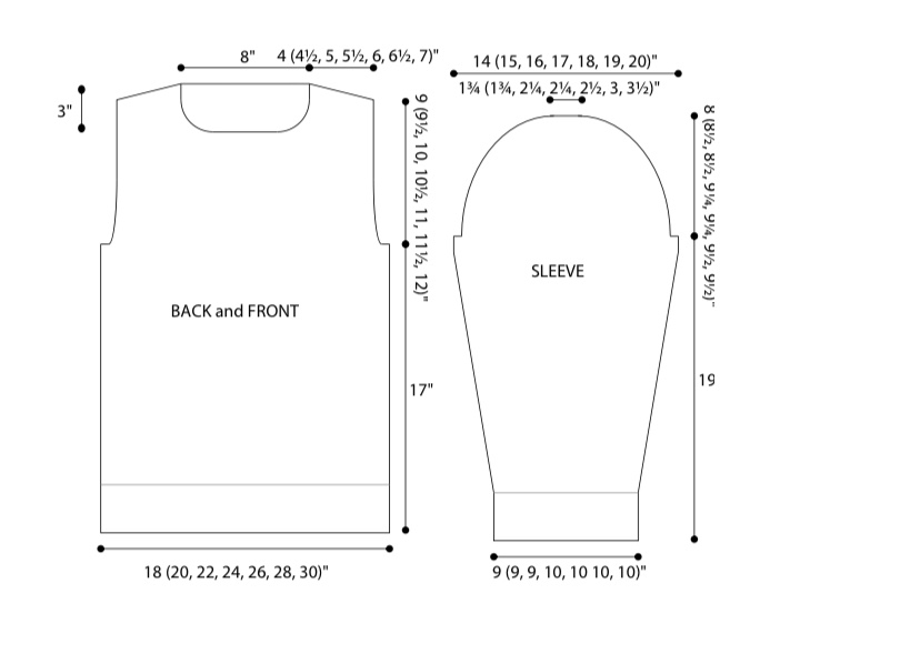 AUMENTI (RS): 1 dir, M1R, dir fino all’ultima m, M1L, 1 dir —2 m aumentate . Rip il f di aumenti ogni 10 Ferri ( 8-6-6-6-6-4) per 3 (5, 15, 13, 9, 3, 24) volte , poi ogni 8 Ferri ( 6-4-4-4-4-0) per 8 (9, 1, 4, 10, 19, 0) volte — 69 (75, 79, 85, 89, 95, 99) m. Lav fino a 47,5 cm dall’inizio finendo con un f sul rov del lav.