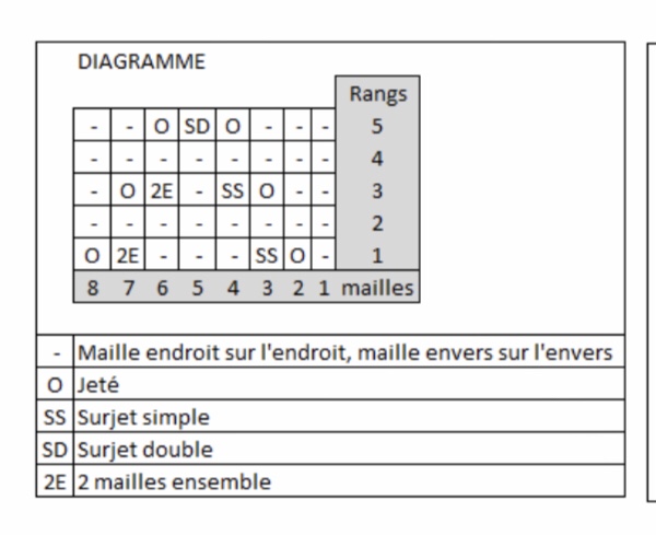 Lav i 5 ferri dello schema poi lav 3 ferri a m rasata distribuendo 23 diminuzioni al secondo ferro =174 m .