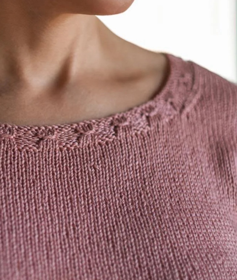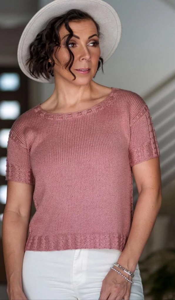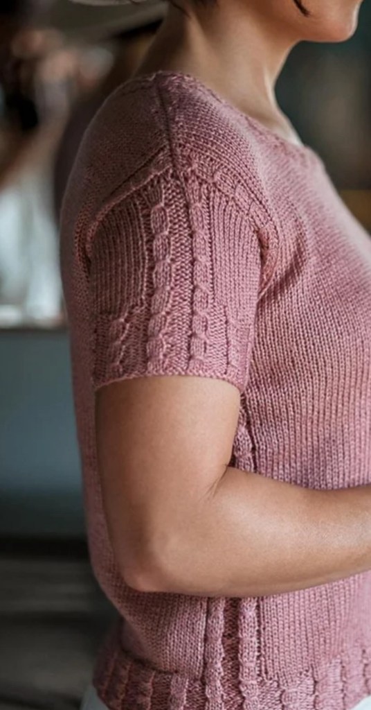 Il capo viene lavorato dal basso verso l’alto, a tutto tondo fino ai giromanica e viene poi separato per la parte anteriore e posteriore,che vengono poi lavorate in piano fino alle spalle. Le spalle sono unite con una chiusura a tre ferri, e per fare le maniche si riprendono le m attorno ai giromanica e lavorate fino al bordo a coste . Questo è il top perfetto per la primavera o l’estate