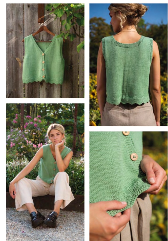 Il top è lavorato avanti e indietro in un unico pezzo, dal basso verso l’alto. Il bordo ondulato inferiore è lavorato per primo e poi il corpo. Quando si chiudono le maglie per ogni sottomanica, il lavoro si separa e il davanti e il dietro sono poi lavorati separatamente. Finire unendo le spalle e aggiungendo i bordi di asole e bottoni.