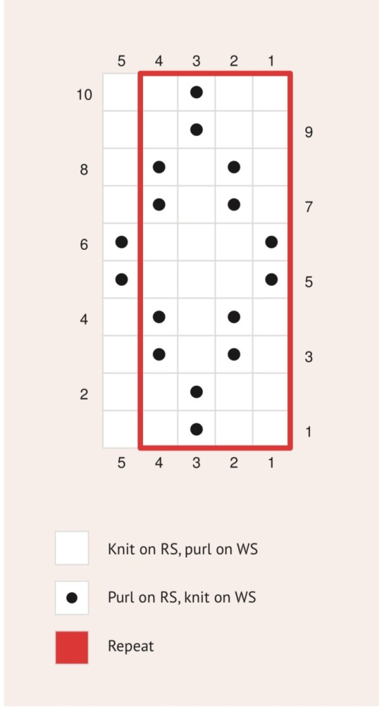 F 3 (WS): lavorare quattro maglie coste, passare il Mark, un rovescio, lavorare a maglia rasata e appunto strutturato il davanti e il dietro, finire con un rovescio, passare il marker, quattro maglie a coste.