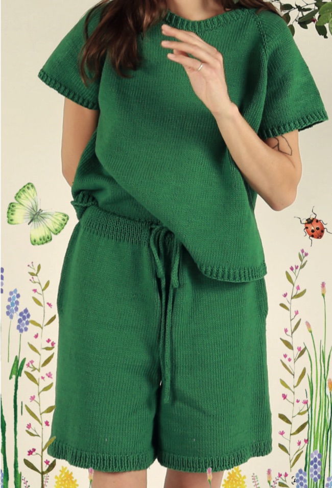 La maglietta è lavorata senza cuciture dall’alto verso il basso con ferri circolari. Si inizia dalla scollatura, poi si lavora lo sprone con aumenti raglan, quindi si dividono le maniche dal corpo e si lavora il corpo, per poi tornare a lavorare le maniche. La maglietta ha circa 5 cm di agio e è progettata per avere una taglia oversize con una forma squadrata. I pantaloncini sono lavorati separatamente, in avanti e indietro ( non in tondo quindi ) , con un leggero aumento ai lati per i fianchi. Non ci sono diminuzioni per adattare la vita. Le due parti saranno unite con una cucitura. Per completare i pantaloncini, viene lavorata una cintura in tondo che terrà il cordoncino. La lunghezza può essere personalizzata. Il modello indossa la taglia media.