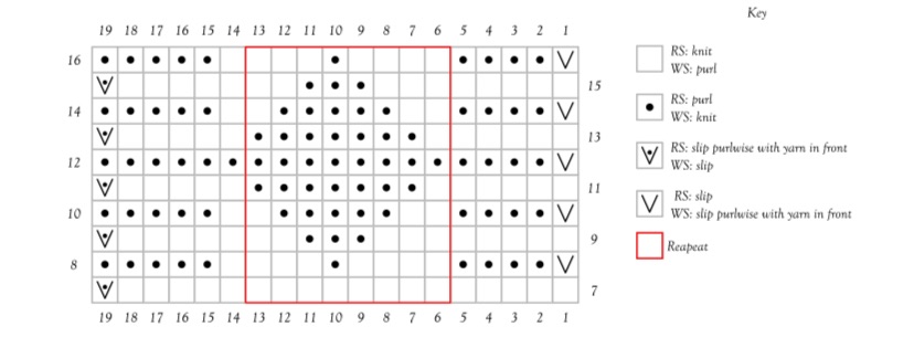 R6 (WS): 5 dir , pm, dir fino alle ultime 5 m , pm, 4 dir, sl1wyif. Gira il lavoro. (i marcatori sono per ricordarti i Bordi a legaccio ; possono essere saltati)