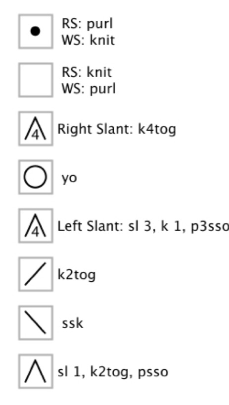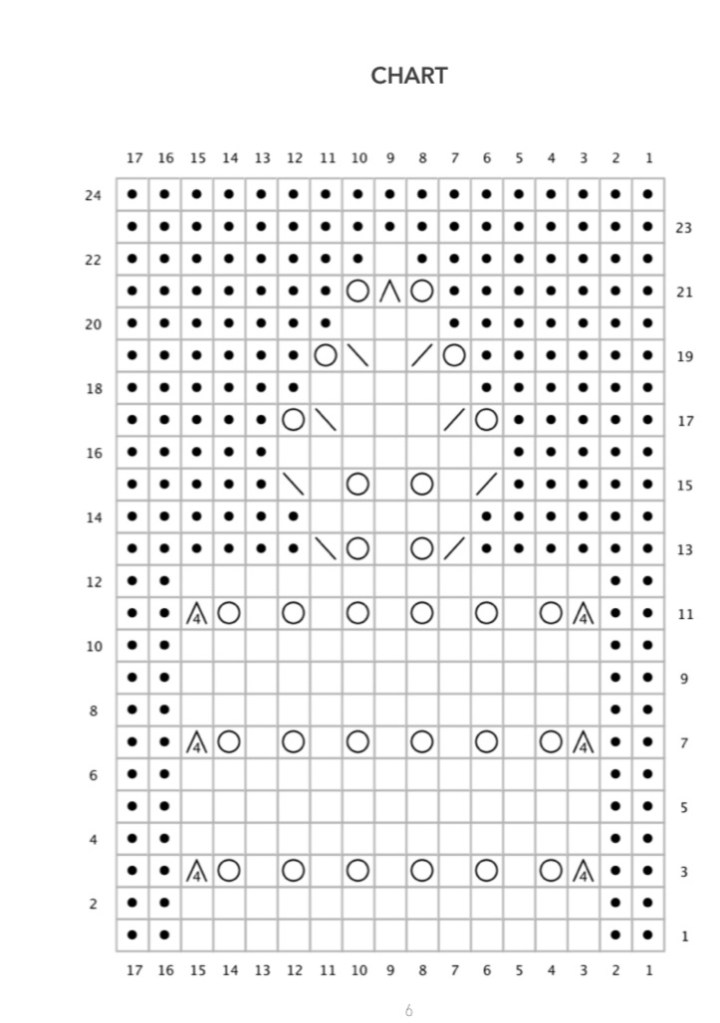 Ferro 21: Passa la prima maglia a rov., dir. fino a m, sm, 7 rov., 1 gettato, passa 1 maglia a dir., 2 dir. insieme, accavalla la maglia passata sopra (psso), 1 gettato, 7 rov., sm, dir. fino alla fine.