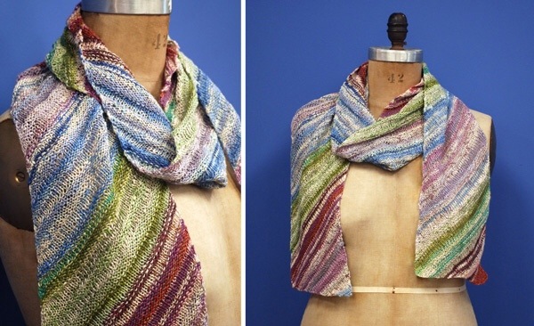 Un'estremità è di qualche centimetro più lunga dell'altra per un bel drappeggio. Il corpo principale della sciarpa presenta un motivo a punto legaccio. La sciarpa è lavorata utilizzando due fili di mohair insieme.