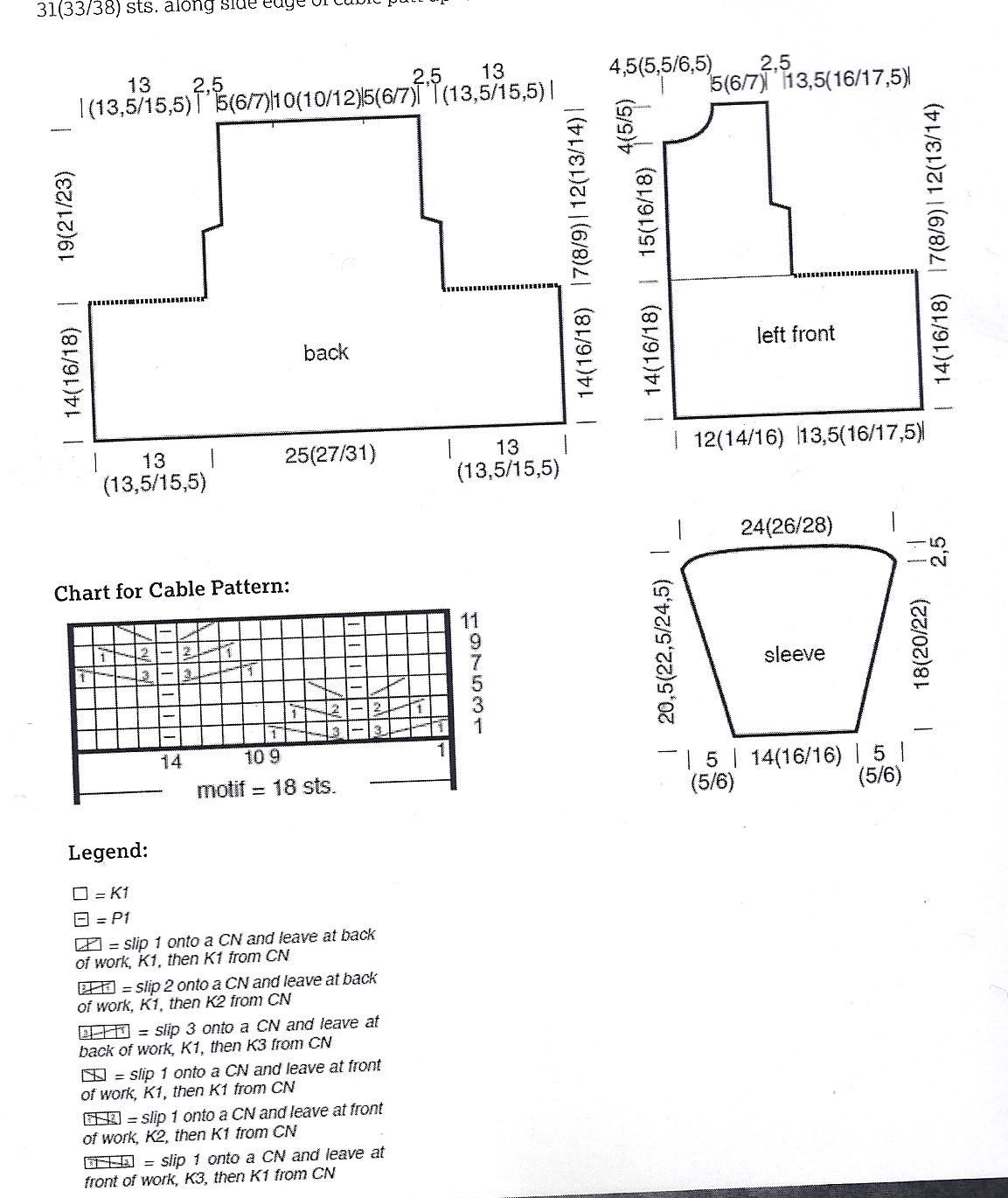 A 23-20-19-17-16 cm. per il raglan eseguire sul lato sinistro le diminuzioni come indicato per il dietro per: 22-20-18-17-16 volte, allo stesso tempo, a 30-26-24-23-23 cm.intrecciare per la scollatura 10 m.(10-9-9-8) 2 m. ogni 2 ferri per 3 (2-2-1-1) volte, infine chiudere le maglie rimanenti.